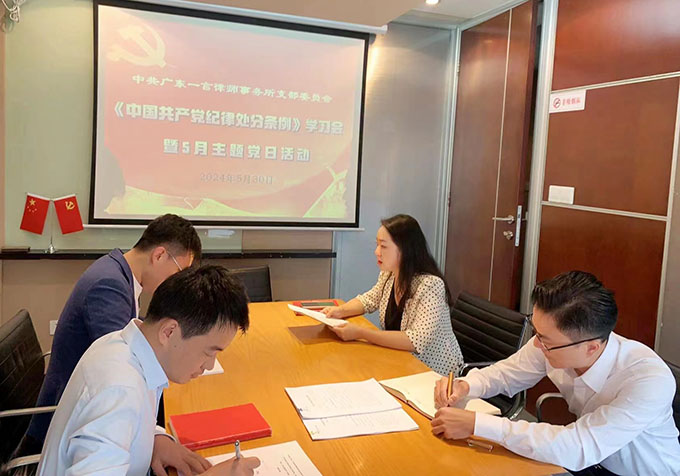 为贯彻落实市行业党委关于开展党纪学习教育的工作要求,2023年5月30日下午,广东一言律师事务所党支部在律所会议室召开了《中国共产党纪律处分条例》学习会暨5月主题党日活动。