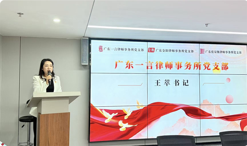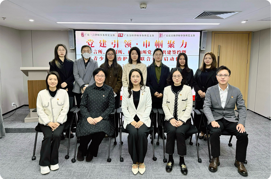 。。2026年3月11日,广东一言律师事务所、广东金阳律师事务所、广东度量衡律师事务所党支部共建签约暨“青少年法治护航”联合行动启动仪式,在一言所多功能报告厅隆重举行。一言所党支部书记王萃、金阳所党支部书记汪凌、度量衡所党支部书记吴丽丹以及各所党员律师、入党积极分子代表共同参与本次活动。