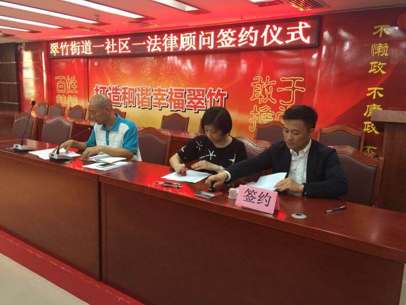2015年4月30日,广东一言律师事务所主任袁伟乐律师率队参与罗湖区莲塘街道以及翠竹街道“一社区一法律顾问”签约仪式。一言所袁伟乐律师、李津泽律师、朱明生律师、王萃律师、孙俊律师、林漫漫律师、罗军华律师获聘担任翠竹街道及莲塘街道社区的村居法律顾问。罗湖区司法局、翠竹街道党工委办事处、莲塘街道党工委办事处、街道司法所以及各社区人民调解委员会负责人出席了签约仪式。