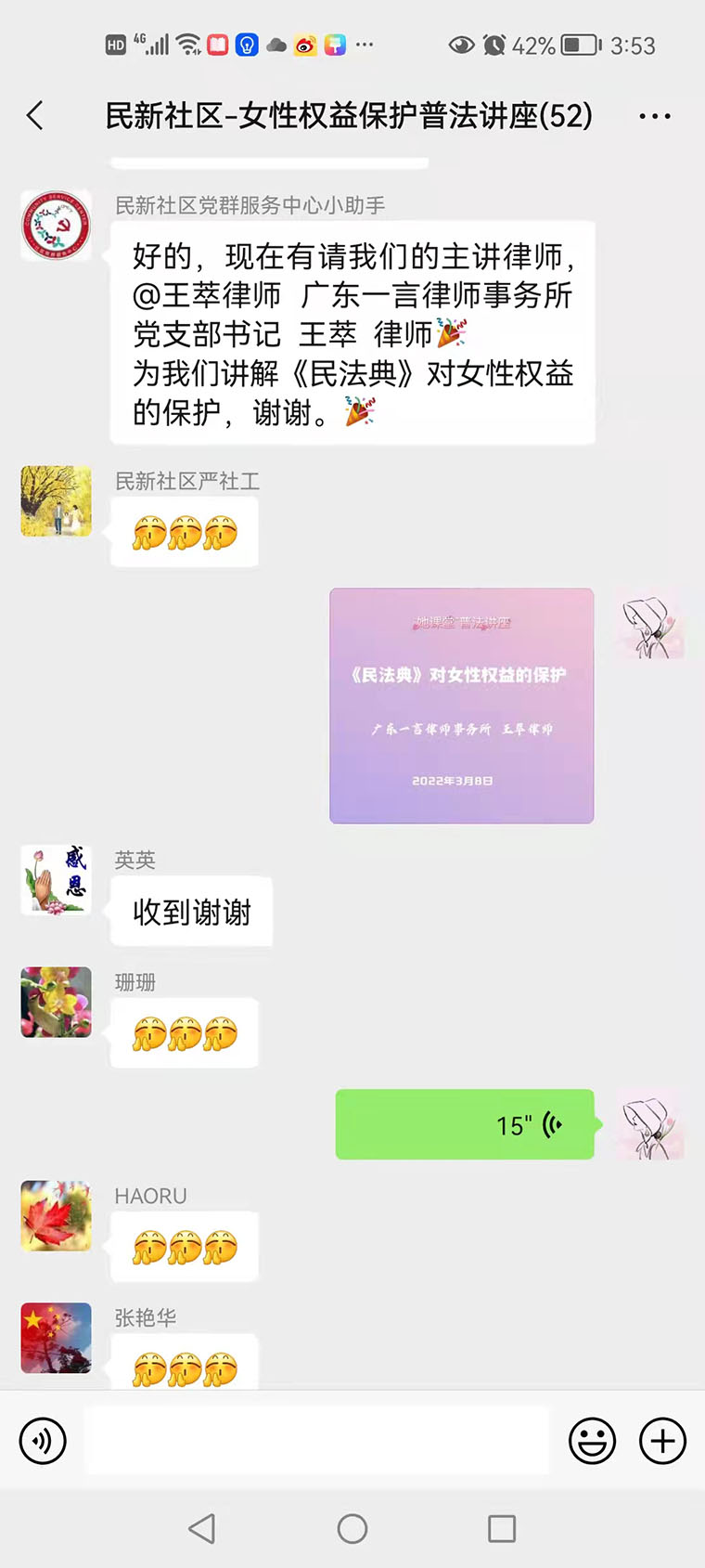 2021年3月8日,广东一言律师事务所党支部联合罗湖区翠竹街道民新社区党群服务中心共同为社区女性朋友送上一份“爱的礼物”,开展了一场关于女性权益保护的线上普法讲座,暨3月主题党日活动,共吸引了50余人参与。