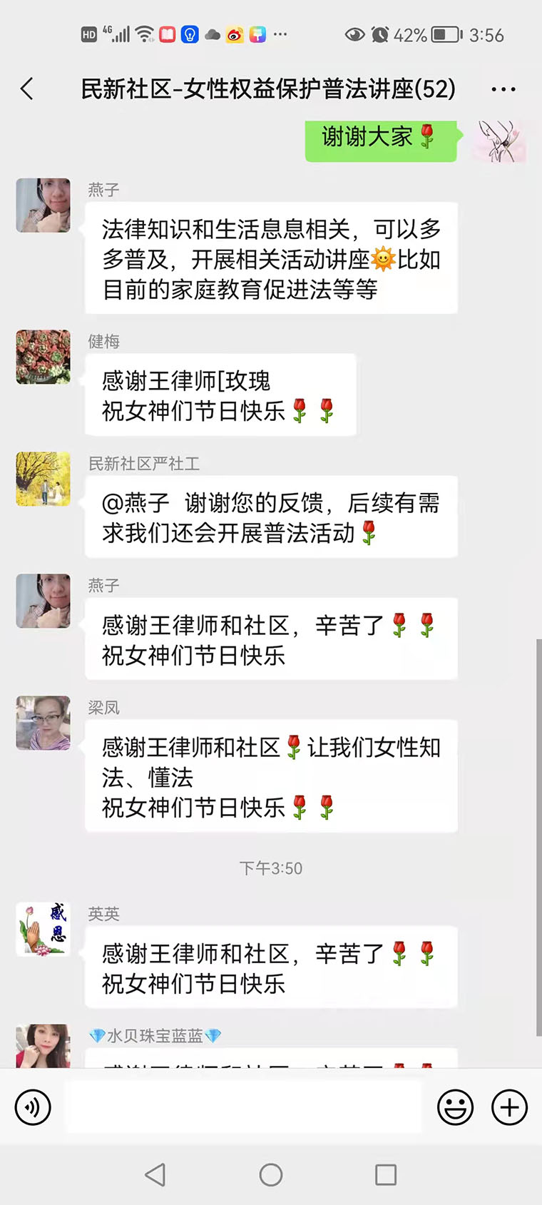 本次普法讲座不仅增加了社区女性居民的法律知识,提高了法律意识,更通过一个个鲜明生动的案例鼓励女性要自尊、自信、自立和自强,获得了民新社区居民的一致好评,进一步推动了支部党建工作和律所业务工作的相融合。