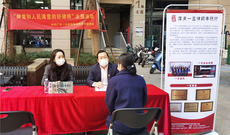 为认真贯彻落实习近平总书记关于“努力做党和人民满意的好律师”的重要指示,践行人民律师为人民的服务理念。在全国第五个宪法宣传周来临之际,2022年12月8日下午,广东一言律师事务所党支部组织党员、发展对象和律所青年律师在深圳市罗湖区翠竹街道木头龙社区开展了“做党和人民满意的好律师”主题党日活动,为社区人民群众提供普法惠民公益法律咨询服务。