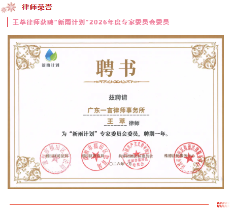 。。2026年1月29日,2025年度“新雨计划”总结表彰活动隆重举行。广东一言律师事务所党支部书记、“一班一员”青少年公益普法项目负责人王萃律师应邀出席。
